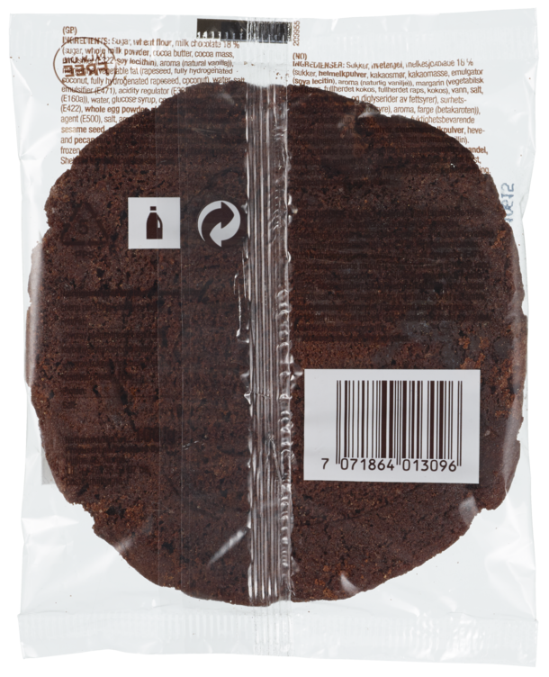 Sukker, hvetemel, melkesjokolade 18 % (sukker, helmelkpulver, kakaosmør, kakaomasse, emulgator (soya lecitin), aroma (naturlig vanilje)), margarin (vegetabilsk fett (raps, fullherdet kokos, fullherdet raps, kokos), vann, salt, emulgator (mono- og diglyserider av fettsyrer), surhetsregulerende middel (sitronsyre), aroma, farge (betakaroten)), vann, glukosesirup, kakaopulver 3 %, fuktighetsbevarende middel (glyserol), heleggpulver, skummetmelkpulver, hevemiddel (natriumhydrogenkarbonat), salt, aroma (vanillin).