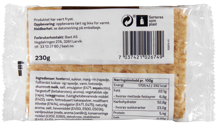 | Oppbevaring | Frysevare -18°C til -26°C |