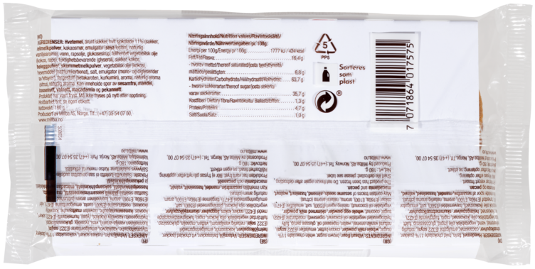 hveteMEL, brunt sukker, hvit sjokolade 11% (sukker, HELmelkPULVER, kakaosmør, emulgator (soya lecitin), naturlig vaniljearoma), vann, rapsolje, glukosesirup, fullherdet vegetabilsk olje (kokos, raps), fuktighetsbevarende (glyserol), sukker, kokos, HELeggPULVER, SKUMMETmelkPULVER, vegetabilsk olje (kokos), hevemiddel (natriumkarbonat), salt, emulgator (mono- og diglyserider av fettsyrer), fargestoff (betakaroten, kurkumin), aroma, naturlig aroma (sitrus), naturlig aroma.
