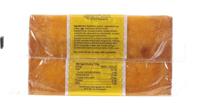 hvetemel, sukker, vegetabilsk olje (raps), egg, stabilisator (e422, E415), hvetestivelse, strøssel (sukker, shellak (E904), potetstivelse, glukosesirup, solsikkeolje, aromaer, overflatebehandlingsmiddel (E901), hyllebærkonsentrat, surhetsregulerende middel (E330), antioksidant (E300), farge (E131, E160a)), modifisert stivelse (E1422), hevemiddel (E450, E500 inneholder hvete), salt, konserveringsmiddel (E202, E281), aromaer (sitron 0,3%), vann